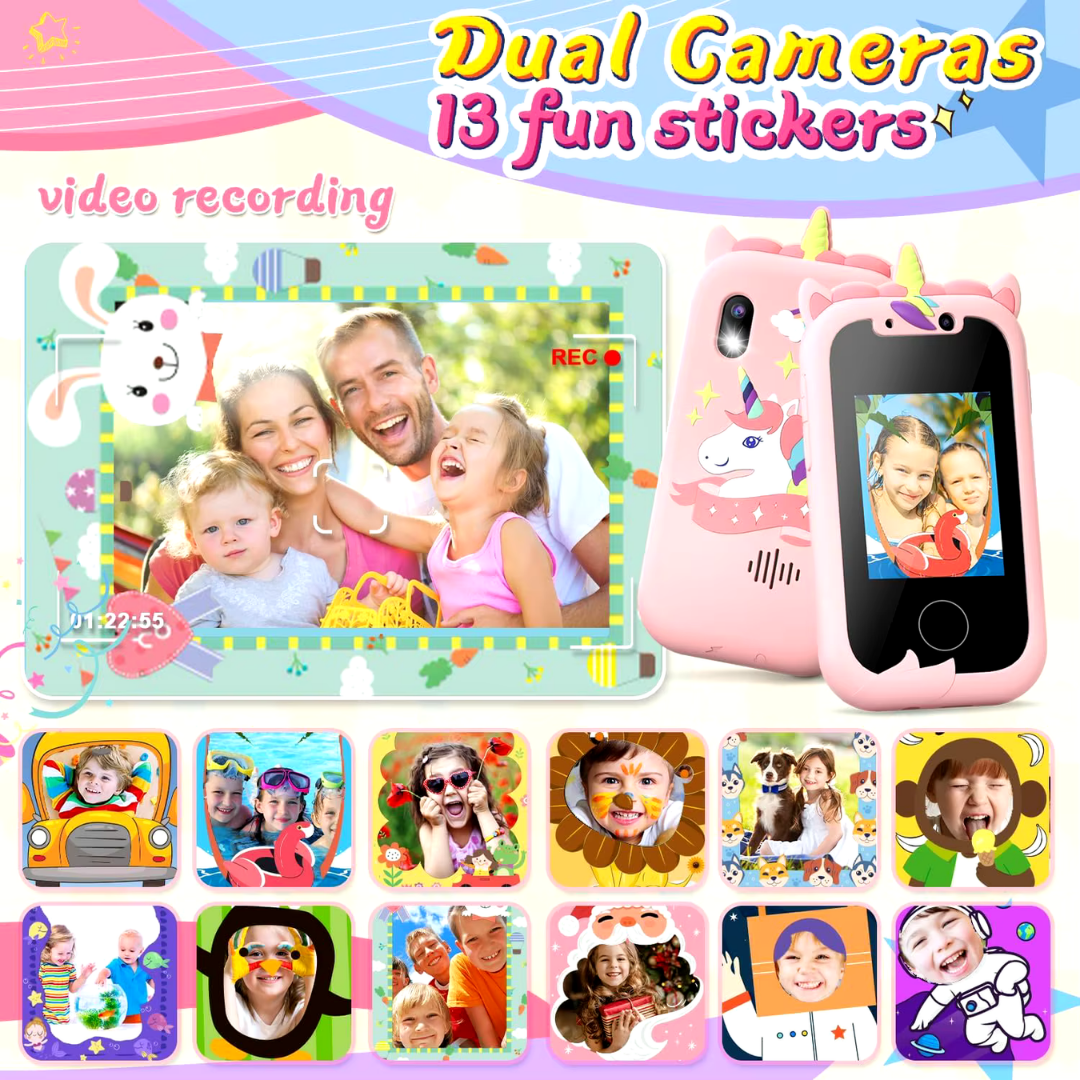 Este teléfono para niños está equipado con una pantalla táctil de alta calidad que facilita su uso. Las cámaras duales de 300,000 píxeles permiten a los pequeños capturar selfies, hacer videos y disfrutar de imágenes nítidas para guardar recuerdos especiales.